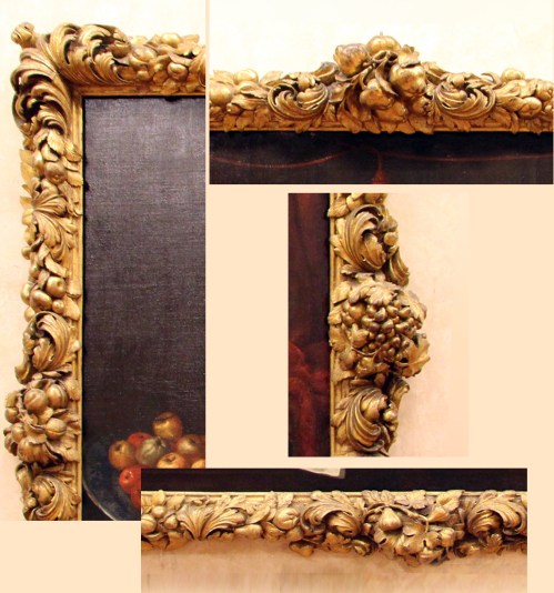 Crosten could change the scale of his work from the 1 foot high frame of Galileo’s lens to the large giltwood foliate tympanum carved in the arch of the Alcova in the Palazzo Pitti; he also carved various scrolling and pierced acanthus leaf frames for Cosimo III. However, the Medicean work he is best known for is the group of attributive fruit frames made for a series of paintings by Bartolomeo Bimbi.