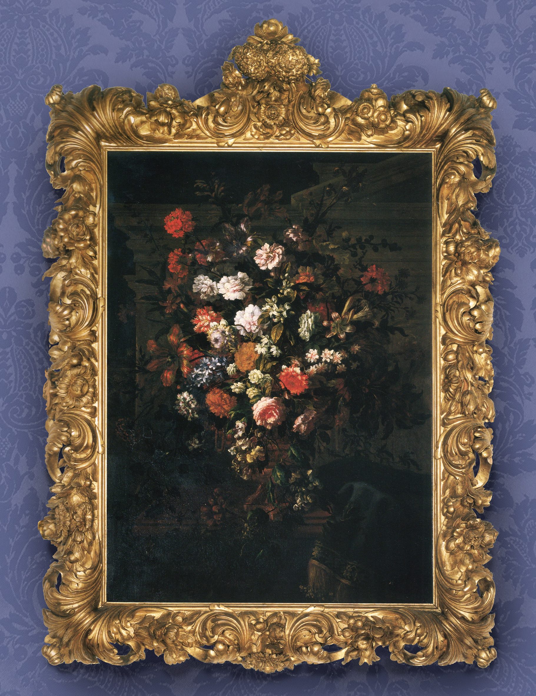 As with his paintings of fruit, some at least of Bimbi’s flowerpieces were framed by Crosten. This Dürer-like image of a carnation plant with two blooms (possibly two views of a single flower) has an anthropomorphic resonance to it, like the double portrait of a couple at odds with each other but was presumably painted as the record of a particularly handsome and possibly rare plant, worthy of being framed in a handsome giltwood sculpture. Crosten has given the frame a similar structure to the series he carved for Bimbi’s fruit paintings, save that the smaller size allows for only one centre, at the top. The corners have the same swooping flourishes of acanthus leaves, which also curl along the rail; and wound amongst them are the flowers and leaves of roses, lilies, what are either Tuscan poppies or paeonia officinalis (which grows wild in Italy), and, on the right of the top centre, a large carnation flower. It appears in an inventory of 1700 as a
