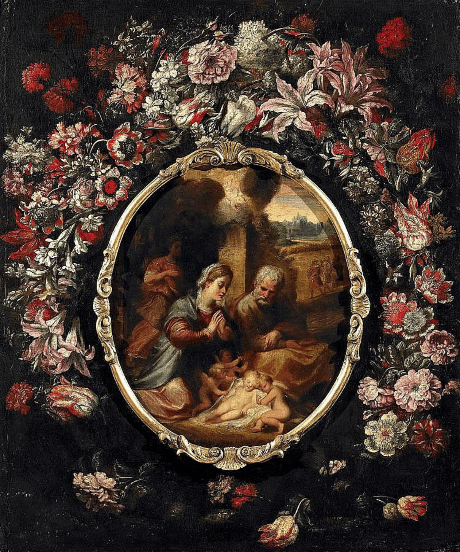 Andrea Scacciati (1642-1710), Adoration of the Christ Child with a floral garland, 115 x 97 cm., Van Ham Kunstauktionen, Cologne, 16 November 2012, Lot 561