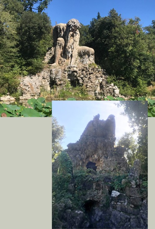 The Appennino didn’t move, but his pose suggested contained or imminent motion, and the water flowing from the monster’s mouth beneath his hand conveyed movement to its surroundings. He was, in a literal sense, the genius of the place, the genius loci, infusing the gardens with a mythological wonder which brought the spectators closer to the classical past inherent in the landscape, the sculptures, and the stories they suggested. And the Appennino was also hollow; he crouched in a cavelike niche which has now vanished, appearing like the spirit of a grotto, an organic part of the rocks he sat amongst, whilst inside him openings led up through three levels, where there were fountains, and rooms for entertainment, music and theatre. A fire and torches could be kindled after dark, which lighted his eyes whilst he appeared to breath out the smoke.