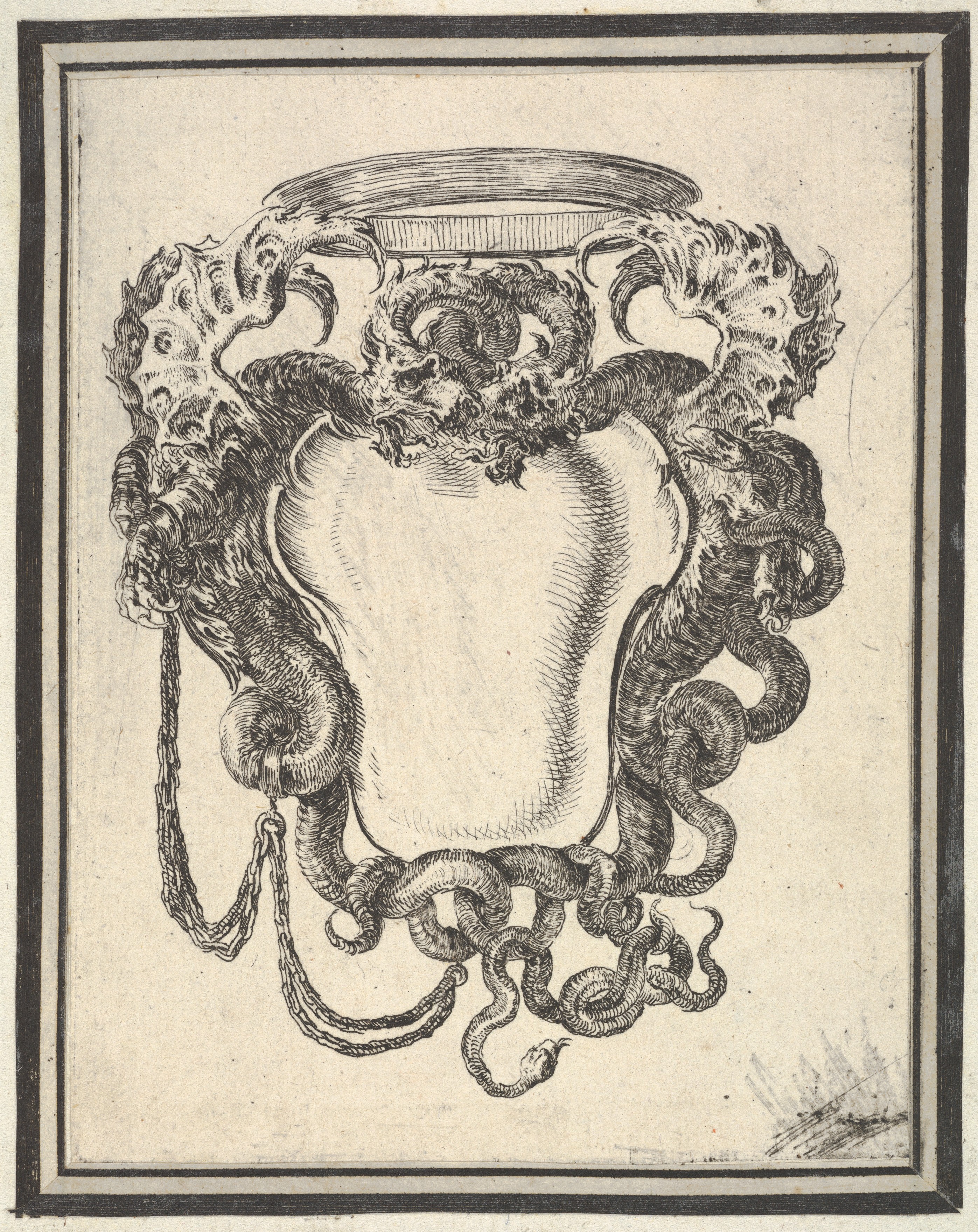 Stefano della Bella (1610-64), Cartouche flanked by dragons, from Nouvelles inventions des cartouches, c.1647, etching, Metropolitan Museum, New York