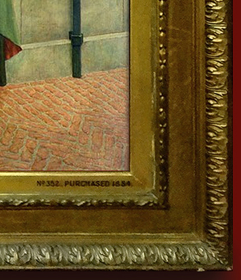 In the group of 1895 paintings, we find it being used – very effectively – for all of the last three types. The version on Candida has been given additional oomph with an acanthus leaf moulding at the back edge, and an auxiliary fluted hollow at the sight. The acanthus leaf branches on the top torus moulding spring from the centre of the bottom rail and meet at the top; they form a rich ornamental foil to the simple lines of the composition, and harmonize with its deeper shades of amber, chestnut and red.