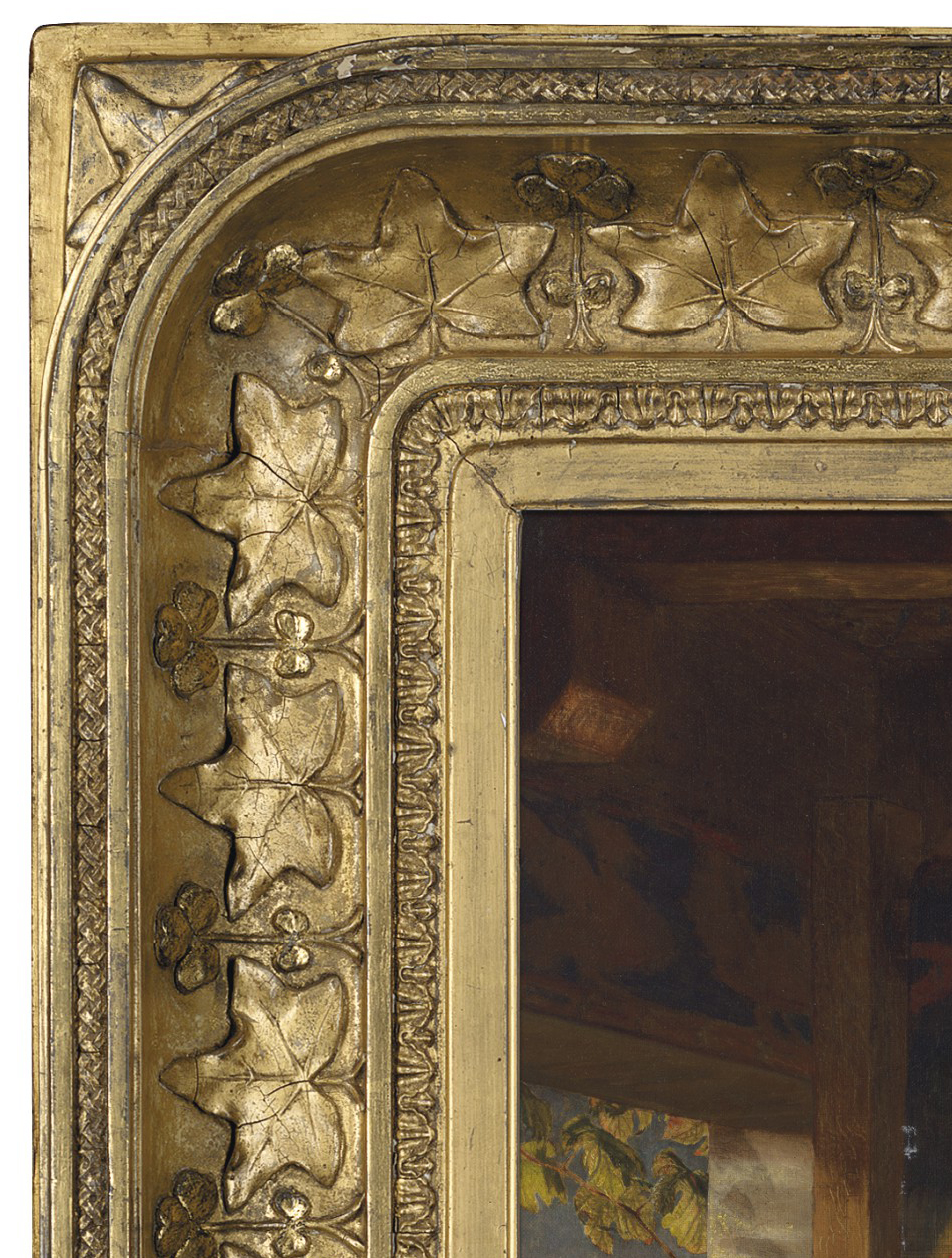 This is supported by lot 21 in the Setton Collection; it has the outer mouldings of a contemporary ‘Watts’ frame, an idiosyncratic leaf pattern punched on the frieze; and a clever conversion of the sight mouldings to a subsidiary plain frieze and deep bevel at the sight edge. This inner section emphasizes the window-like opening of the frame onto the marble parapet and the shallow, curtained space in which the poet stands; it undercuts the flatness of the composition, giving much greater depth to the foreground, and highlighting the thrust of the book and paper forwards, over the sill of the parapet.