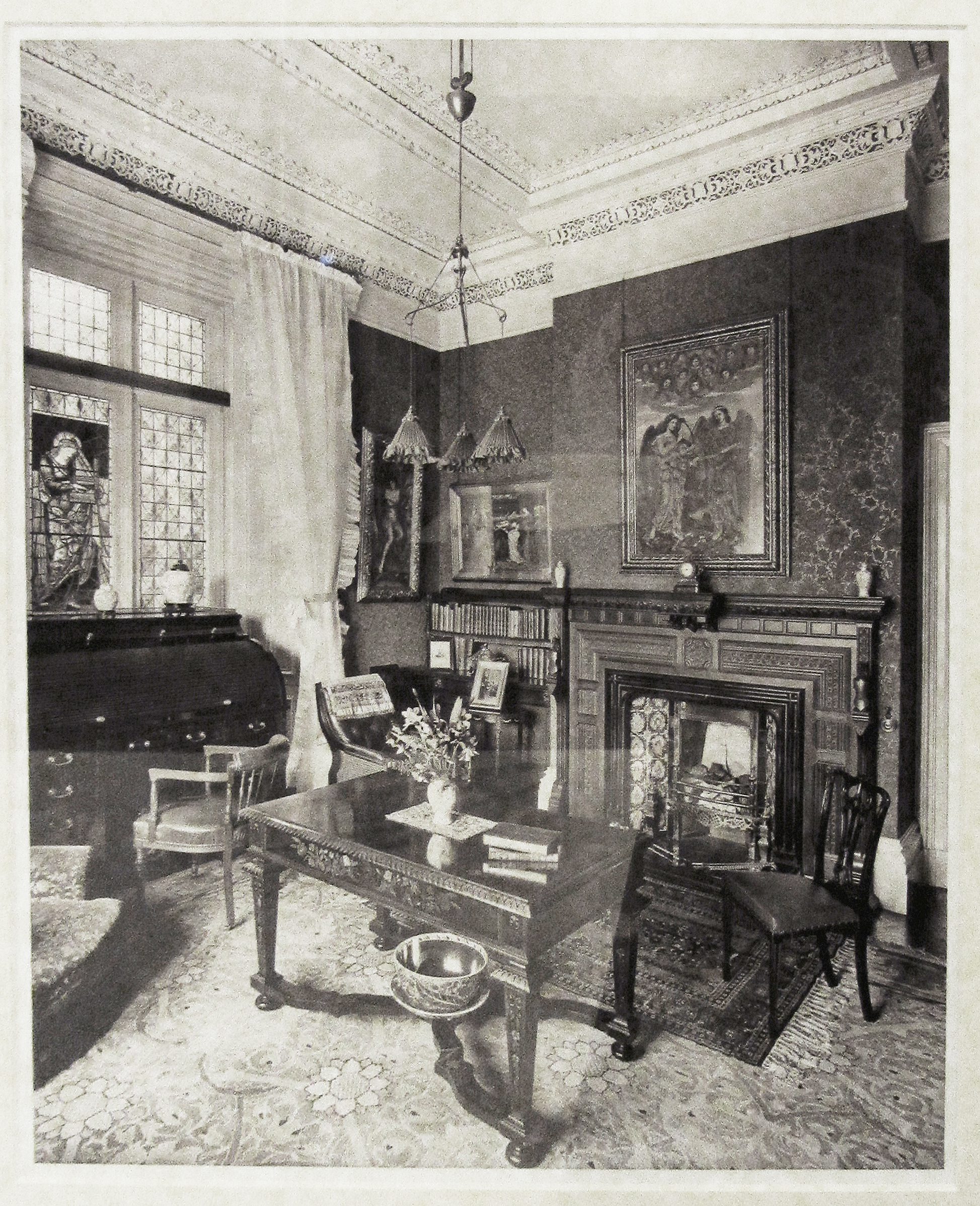 It belonged at first to William Imrie, a partner with J. Bruce Ismay in the shipping line which eventually passed to J.P. Morgan and (some years after Imrie’s death) built the Titanic. Imrie was also a collector of Pre-Raphaelite and associated art. Amongst other things, he owned Burne-Jones’s The tree of forgiveness, two versions by Rossetti of Dante’s dream, paintings by J.M. Strudwick and Spencer Stanhope, and at least two works by Evelyn De Morgan, which are shown in the photo of his library, above.