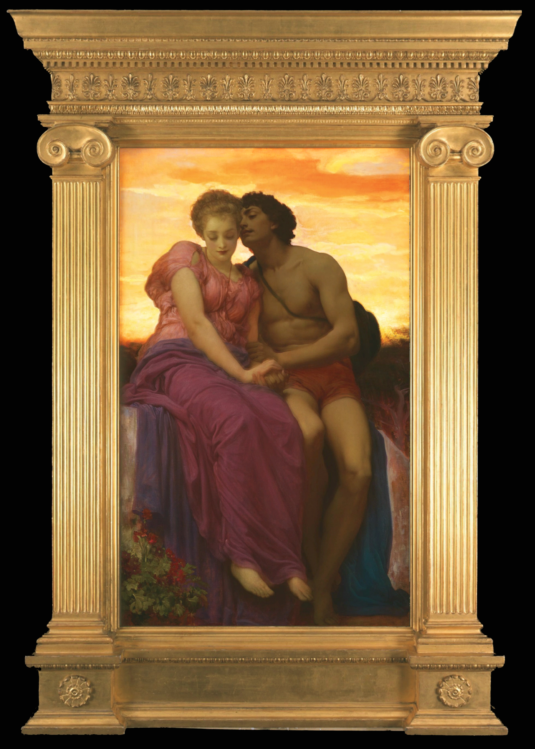 Leighton’s Whispers, which was with Martin Beisly in March this year, has another fine example of a Bassae frame very close to that on Captive Andromache, although obviously much smaller and in a vertical format. It has a predella or plinth with roundels beneath each pilaster, and in this form seems to present the lovers as if through a classical doorway or window, silhouetted against the sunset behind them. Hardly a subject painting at all, Whispers is more an arrangement of curving forms and colour harmonies for which the linear beam and lintel frame creates a geometric foil, undercut by the swooping capitals and the roundels. Together painting and frame epitomize Burne-Jones’s famous definition of a picture as ‘a beautiful, romantic dream… in a light better than any light that ever shone – in a land no one can define or remember, only desire – and the forms divinely beautiful…’ [15]