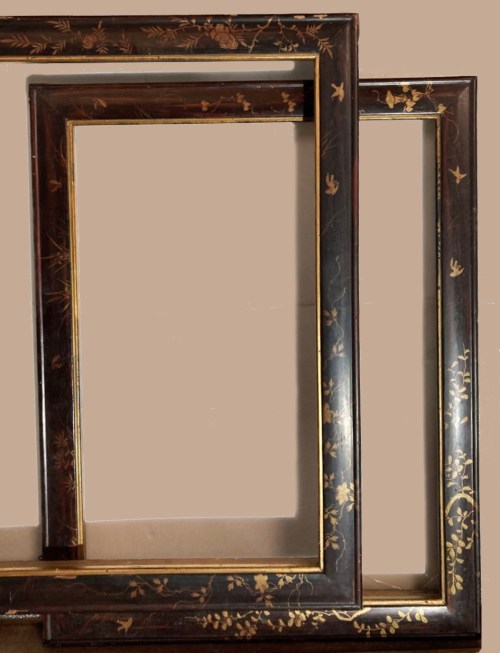Lot 11: a pair of Japanese lacquered wood frames; architrave profile with shallow cushion frieze, decorated with blossoming branches and birds in gold on a black ground; 19th or 20th century; 43.5 x 59 cm.; estimate: €600-800