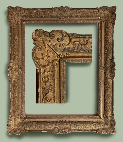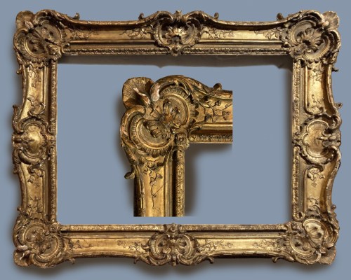 Lot 326: carved giltwood provincial French Rococo frame; concave profile, with scrolled rocaille corners and centres; the hollow fringed with rocailles; mid-18th century; 85 x 108 cm.; estimate: €2,000-3,000