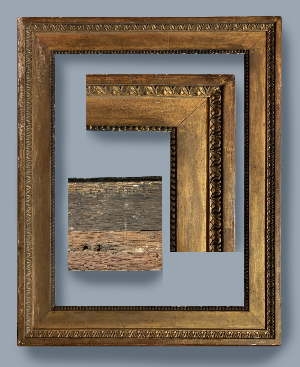 Lot 150: carved giltwood NeoClassical frame; architrave profile, with leaf-&-dart beneath the top edge; beading at the sight edge; signed at the back with the stamp of ‘E. L. INFROIT’ for Etienne-Louis Infroit (maître-sculpteur 14 August 1759; maître-menuisier 12 October 1768), 49.5 x 47.5 cm.: estimate: €800-1,000