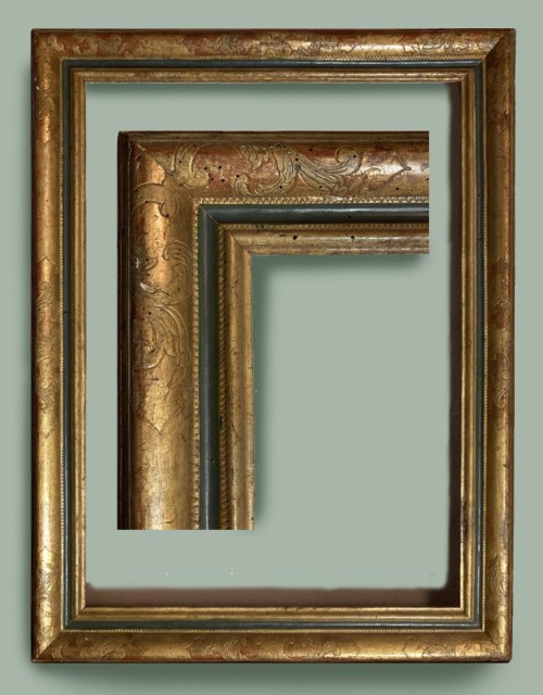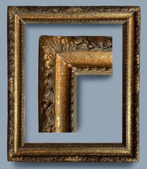 Lot 169: carved giltwood Louis XIII garland frame; torus profile, with a centred garland of bay leaf-&-berry, rose-&-rose leaf at the top edge, with acanthus leaf corners and centres; the burnished concave frieze incised with an undulating vine of leaves and flowers, acanthus corners and centres, on a cross-hatched ground; a centred imbricated husk moulding at the sight edge; 17th century; 72 x 59 cm.; estimate: €2,500-3,000