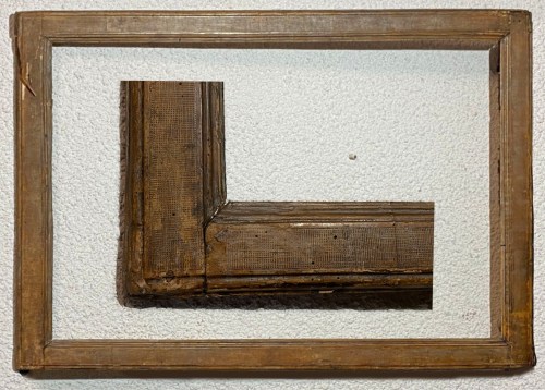 Lot 327: carved giltwood Louis XIII-XIV frame; convex profile with scrolling strapwork, leaf buds, cosses-de-pois and florets on a cross-hatched ground, with acanthus leaf corners; sanded frieze; raking acanthus leaf sight edge on a hatched ground; second half 17th century; 80.5 x 121 cm.; estimate: €2,000-3,000