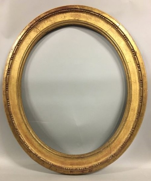 Lot 472: 20th century replica oval giltwood frame in the style of Louis XIII; with acanthus leaf tip at back edge, torus with centred and bound garland of imbricated bay leaf-&-berry, astragal -&-double bead at sight edge; 61 x 50 cm.; estimate €250-350