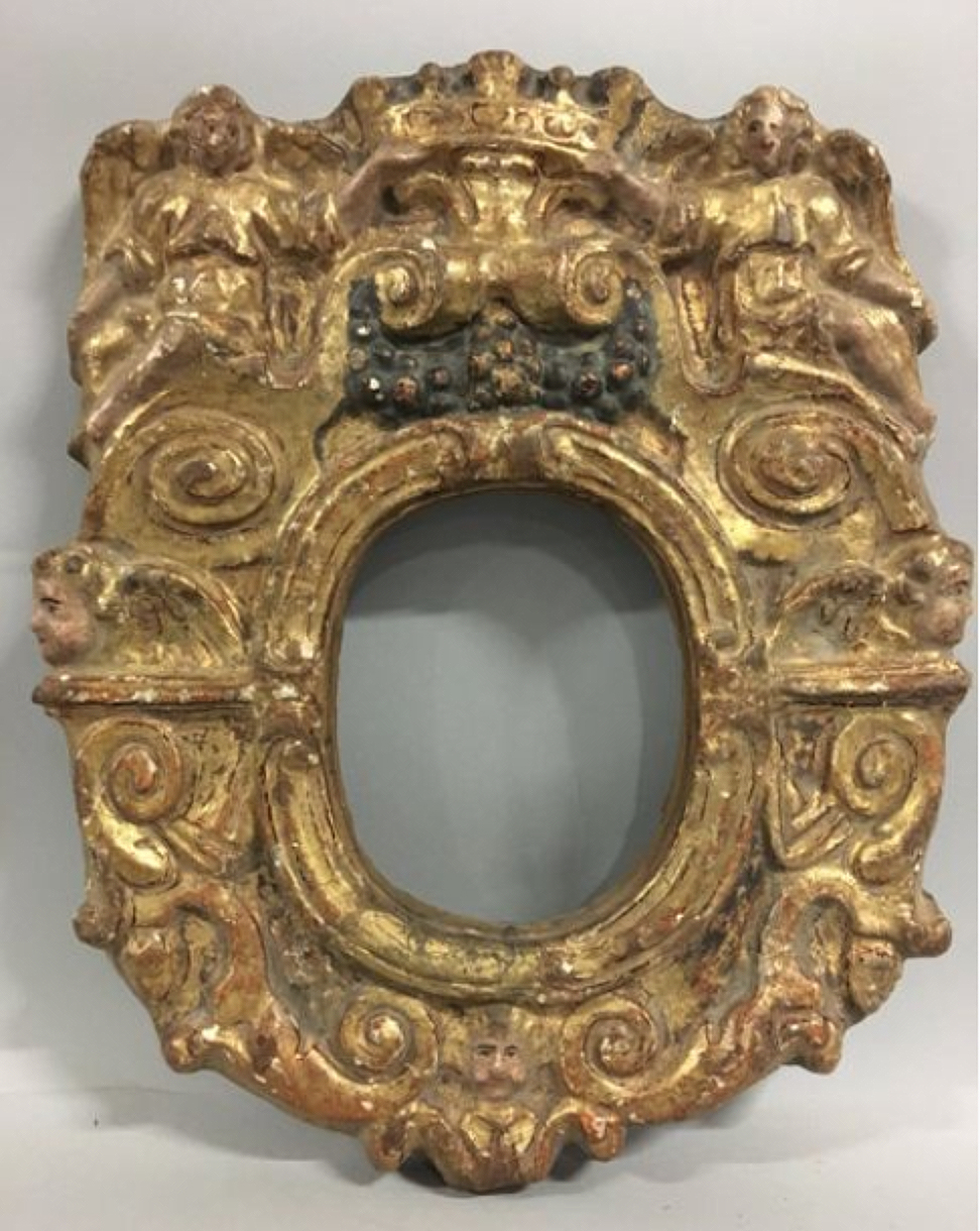 Lot 246: 18th century gilded papier mâché frame, Italian or Spanish, with two angels supporting a crown at the crest, and three cherubs’ heads at the sides and base between scrolls and cornucopiae, a floral swag at the top and the infill of the crown picked out in paint; a scrolling strapwork oval sight; 15 x 12 cm.; estimate €600-900