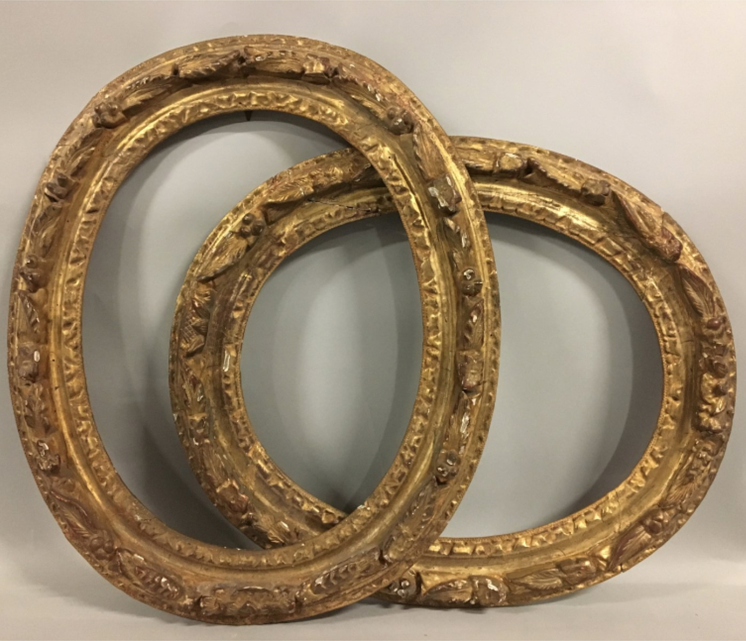 Lot 249: 17th century French Louis XIII gilded oak oval frames, a pair; with leaf tip and hazzled back edge, a garland of bay and oak leaves with florets, acanthus leaf tip and hazzled sight edge; 40.5 x 32 cm.; estimate €600-800