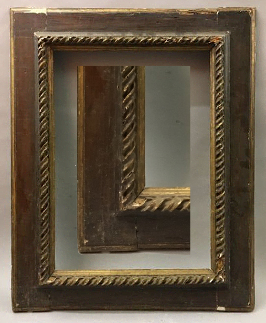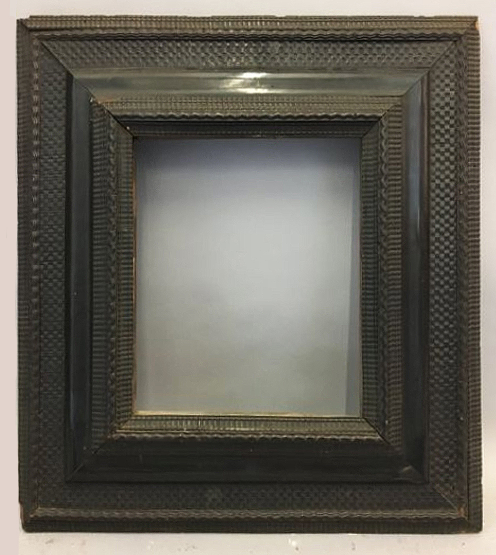 Lot 441: 17th century bolection frame, German, Austrian or Neapolitan; possibly fruitwood?, ebonized; with ripple mouldings at back edge, narrow torus with wave moulding, frieze with basket weave moulding, ripple mouldings, wave moulding at top edge, and ripple mouldings at sight edge; 34 x 28 cm.; estimate €600-800
