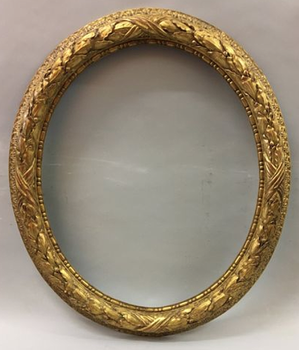 Lot 472: 20th century replica oval giltwood frame in the style of Louis XIII; with acanthus leaf tip at back edge, torus with centred and bound garland of imbricated bay leaf-&-berry, astragal -&-double bead at sight edge; 61 x 50 cm.; estimate €250-350