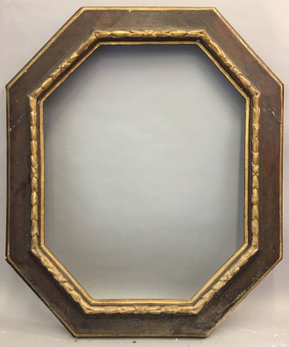 Lot 540: 17th-18th century Italian Baroque reverse octagonal frame, with centred imbricated bay leaf torus; finished with parcel-gilding and faux wood-grain (restored); 102 x 86 cm.; estimate €800-1,200