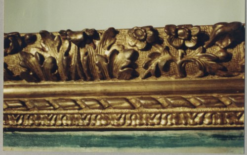 A close-up of one of the centre cartouches shows the fine detail of the ornament, from the veined foliate scrolls to the tiny leaf buds at the sight edge, now paired in all its gilded opulence with the bronzes and greens of a peasant still life. It would be nice to think that this was a joke by the collector against himself and the richness (in all senses) of his collection…