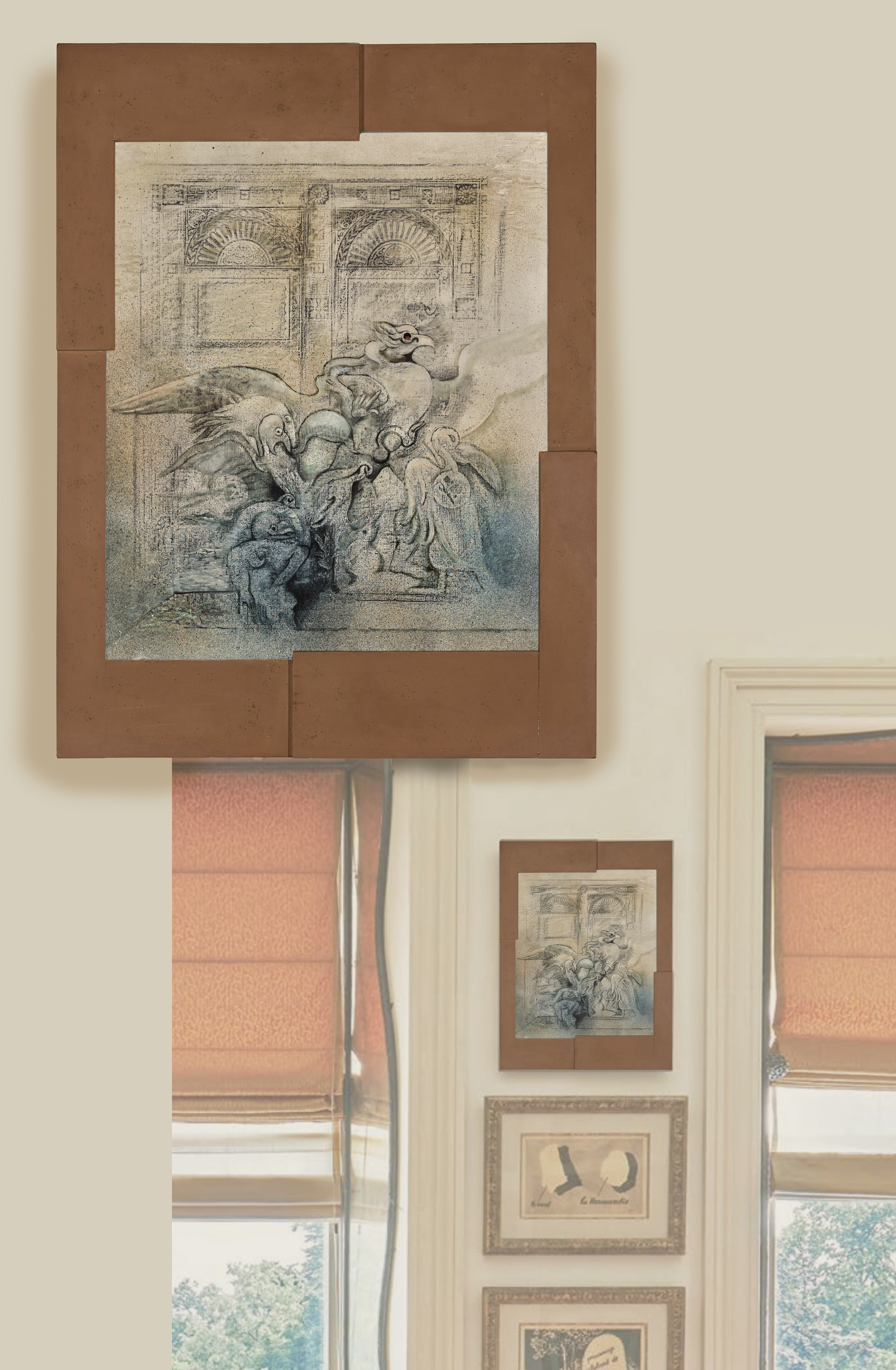 Unlike a frame with symmetrically outset corners, this artist’s frame has outset centres, formed by the diagonally opposite top left and bottom right corners straying further over the picture plane than their brothers. This has a peculiarly disruptive effect on the painting, where the orderly architectural background is set against a winged and lobed organ-like tangle of birds – parrots, phoenix, dodo and chick. The shift in frame corners seems to suggest that the whole work is gradually moving to the right, along the wall, in a disconcertingly cinematic animation of the whole. No wonder Pauline Karpidas kept it firmly trapped in the pier between two window frames…