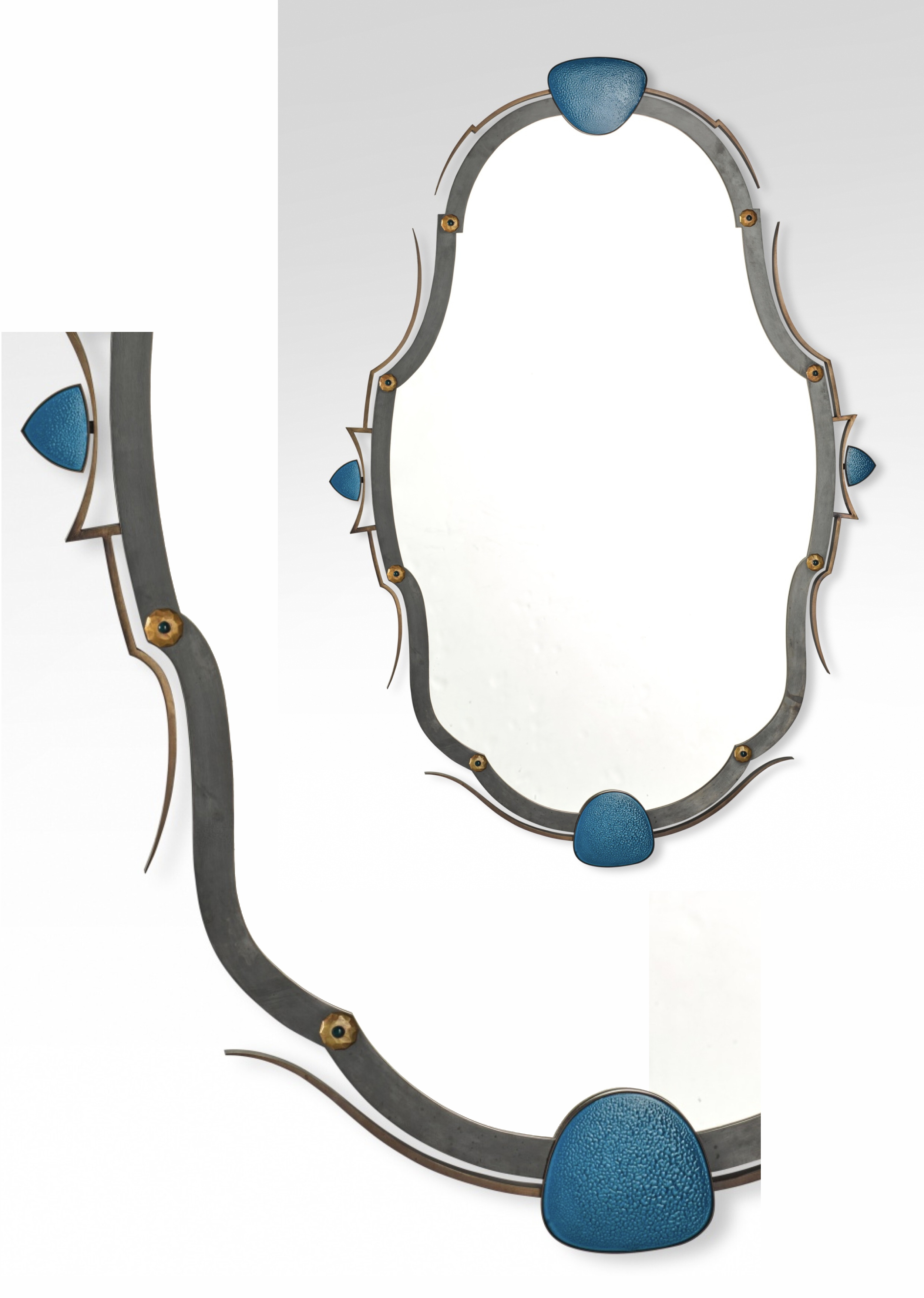 Lot 211: André Dubreuil (1951-2022), looking-glass, patinated steel, enamelled copper and cabochons, 2012, 109.5 x 74.5 cm., commissioned by the owner, with detail; est.: £18,000-25,000