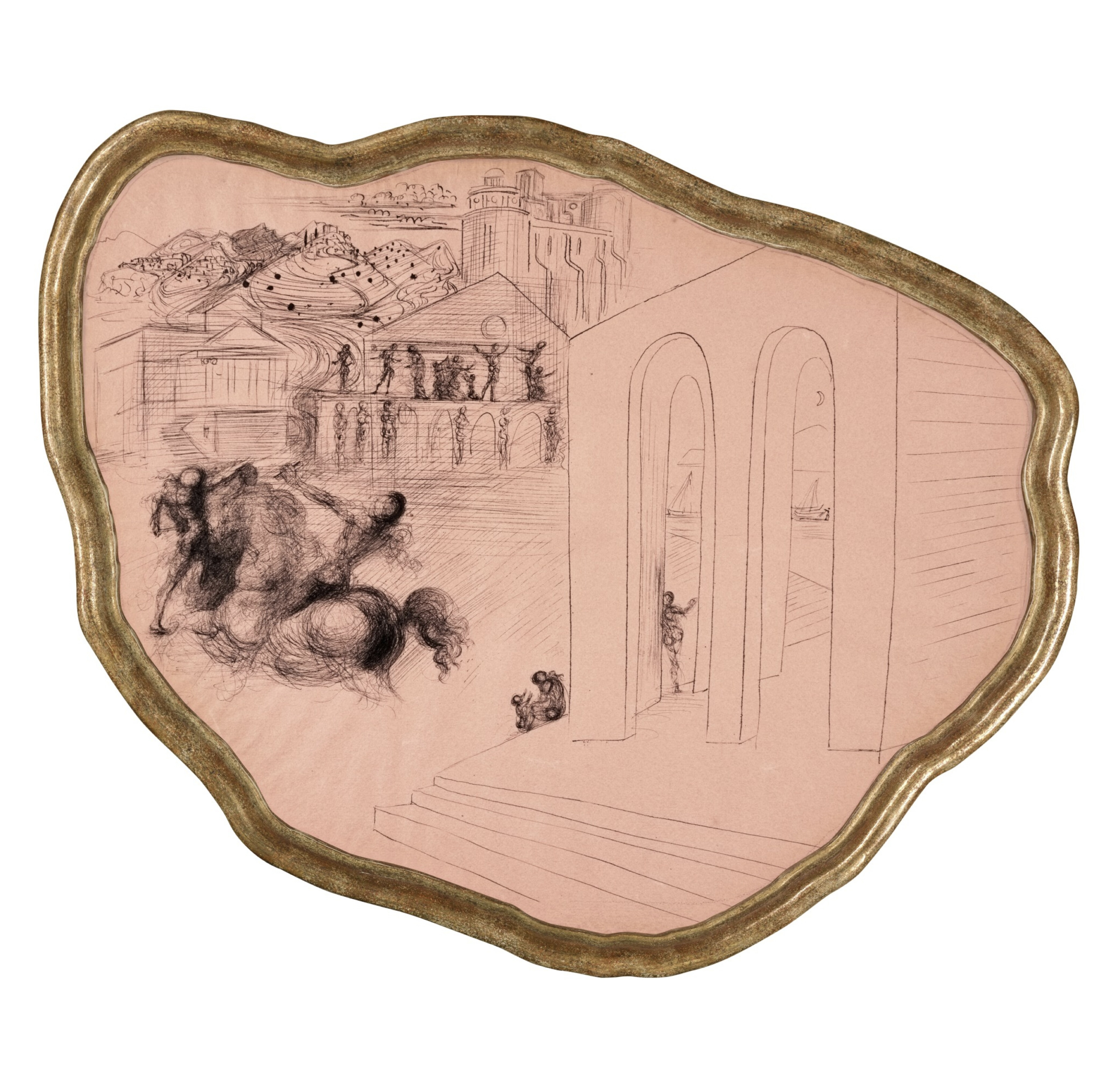 Its frame is Dalí’s own design; it is very similar to the frames of Couple with their heads in the clouds, also from 1936, also owned by Edward James, and now in Rotterdam. In the case of the latter work, it’s the frames themselves which determine the form of the double composition, in a topsy-turvey mastery of the panels by their settings. The drawing here, in the sale, Messager dans un paysage Palladien, does not allow the frame to impose itself on the composition; instead, the melting and formless moulding follows the contour of the paper, creating a cloudlike shape which mirrors the dissolution of the architecture in the image, like the framing of a dream.