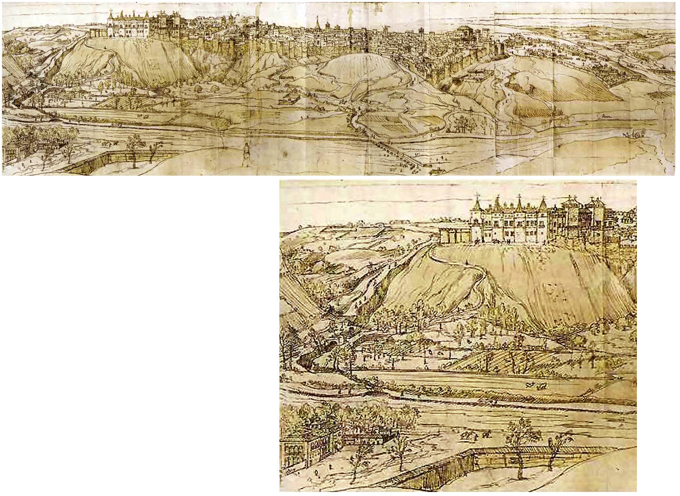 Antoon van den Wijngaerde (1525-71), View of Madrid from the West, pen & colour wash, 1562, & detail of the Alcázar