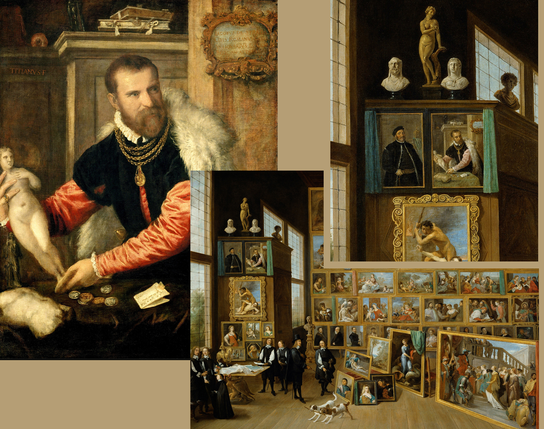 Titian (1490-1576), Jacopo Strada, 1567-68, shown in frame with curtain in David Teniers (1610-90), Archduke Leopold Wilhelm in his picture gallery in Brussels, c.1651, Kunsthistorisches Museum, Vienna