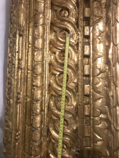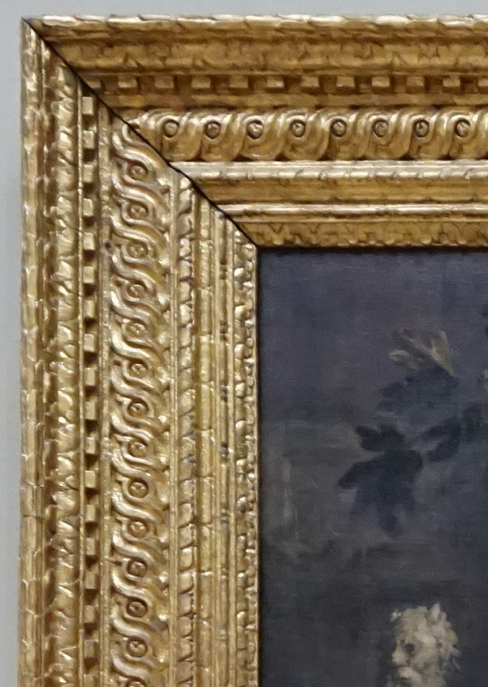 The Pietà has a very beautiful 16th century compound profile frame, which is almost certainly the original – it is too large and too unusual a shape to have been reframed easily in a contemporary period frame, and the corner configurations are unchanged; also, had it been framed on Palma il Giovane’s death for presentation to the church, it would have been given a Baroque pattern, and if thereafter, successive patterns according to the fashion. Given Titian’s age, and the fact that he was painting the altarpiece for what he hoped would be his mortuary chapel, he would have done for himself what artists customarily did for their patrons, and provided for the frame whilst the painting was in progress. It has a rare seven orders of ornament, closely packed in a wide shimmering braid of complex facets, centred on a convex moulding decorated with a wide guilloche; the centres of the guilloche are enriched with what seem to be small pomegranates – the symbol of resurrection.
