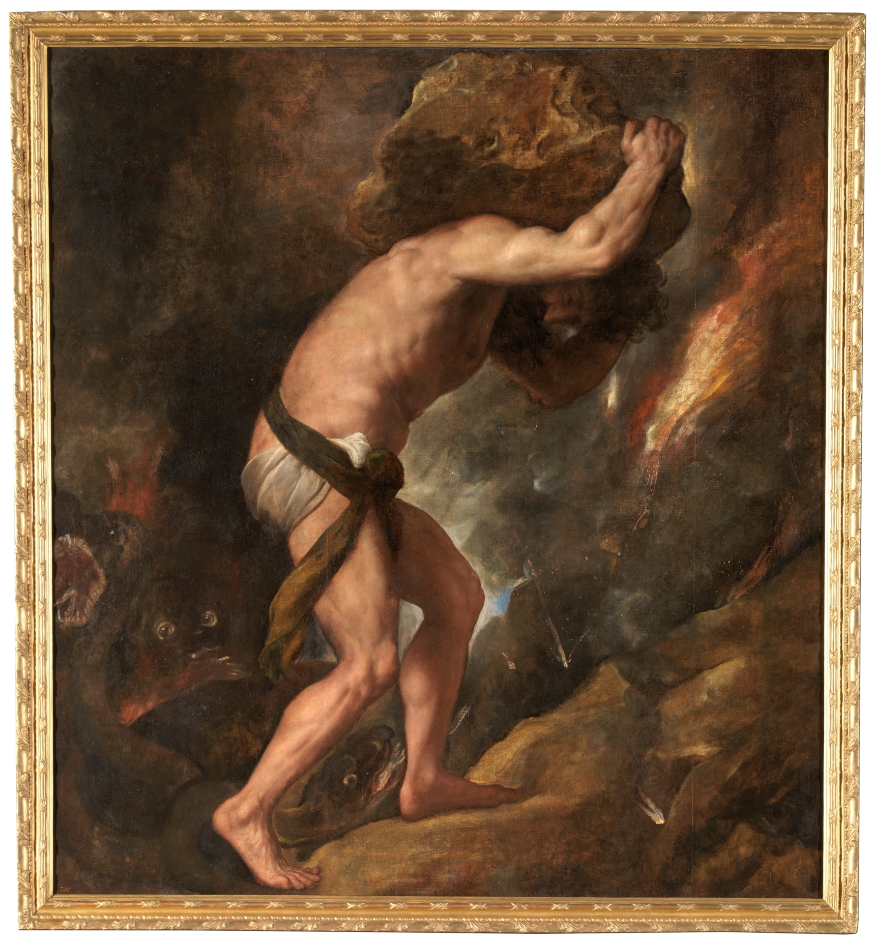 Titian was commissioned at the same time to paint a series of four large mythological subjects for the sister of Charles V, Mary of Hungary, ruler of the Netherlands. These depicted the torments visited on those who had rebelled against the gods, such as Tityus (condemned, like Prometheus, to have his eternally-regenerating liver eaten by birds of prey), and Sisyphus (always pushing his vast stone up a just-unconquerable hill).