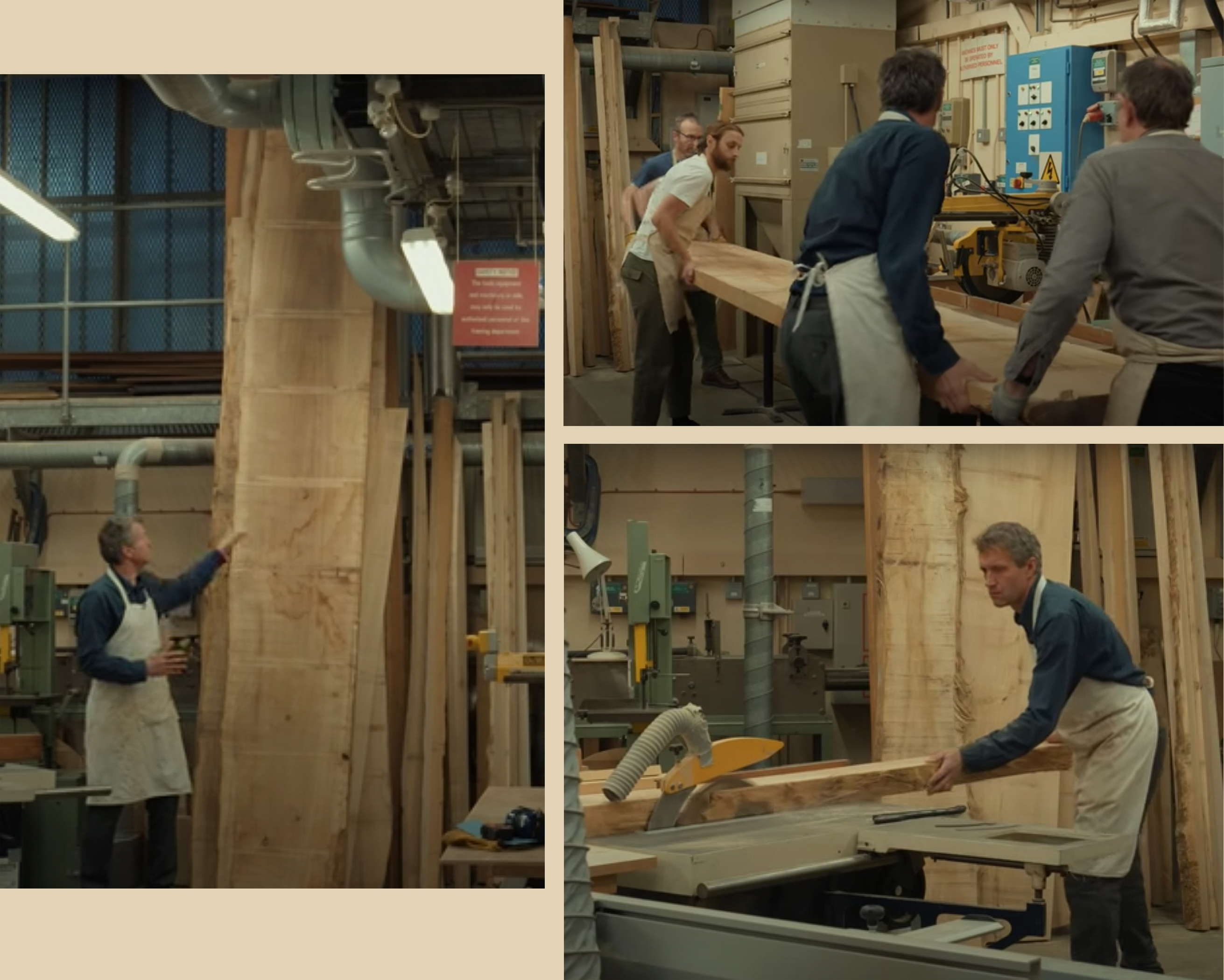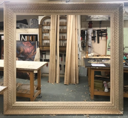 The frames use the same species of wood from which Titian’s own frames would have been made, including the frame for the Pietà. This is the fast-growing European Black Poplar, which is fully mature in around forty years, reaching the width of the boards in the image above; it has a close grain and when dry it doesn’t tend to split. The Gallery buys a whole trunk, which is ordered about six months in advance and arrives cut into massive boards. These are sawn into frame-sized planks in the workshop, and then the profile is shaped by hand (mechanical saws which produce machine-cut mouldings are a product of the industrial revolution in the 19th century; the shaped wood which they extrude has a uniformity which undermines the sculptural art of the workshop).