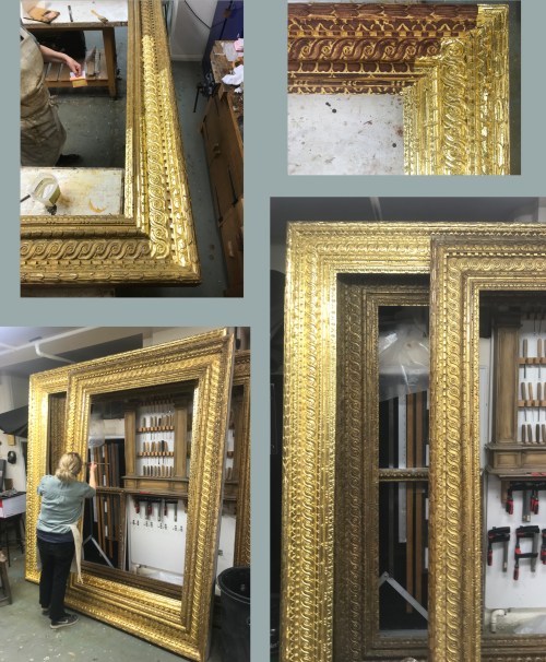 The process of gilding; corner showing gilder’s bole & gold leaf applied; gessoing, bole and finishing by Amanda Dickson; frames in various stages of patination