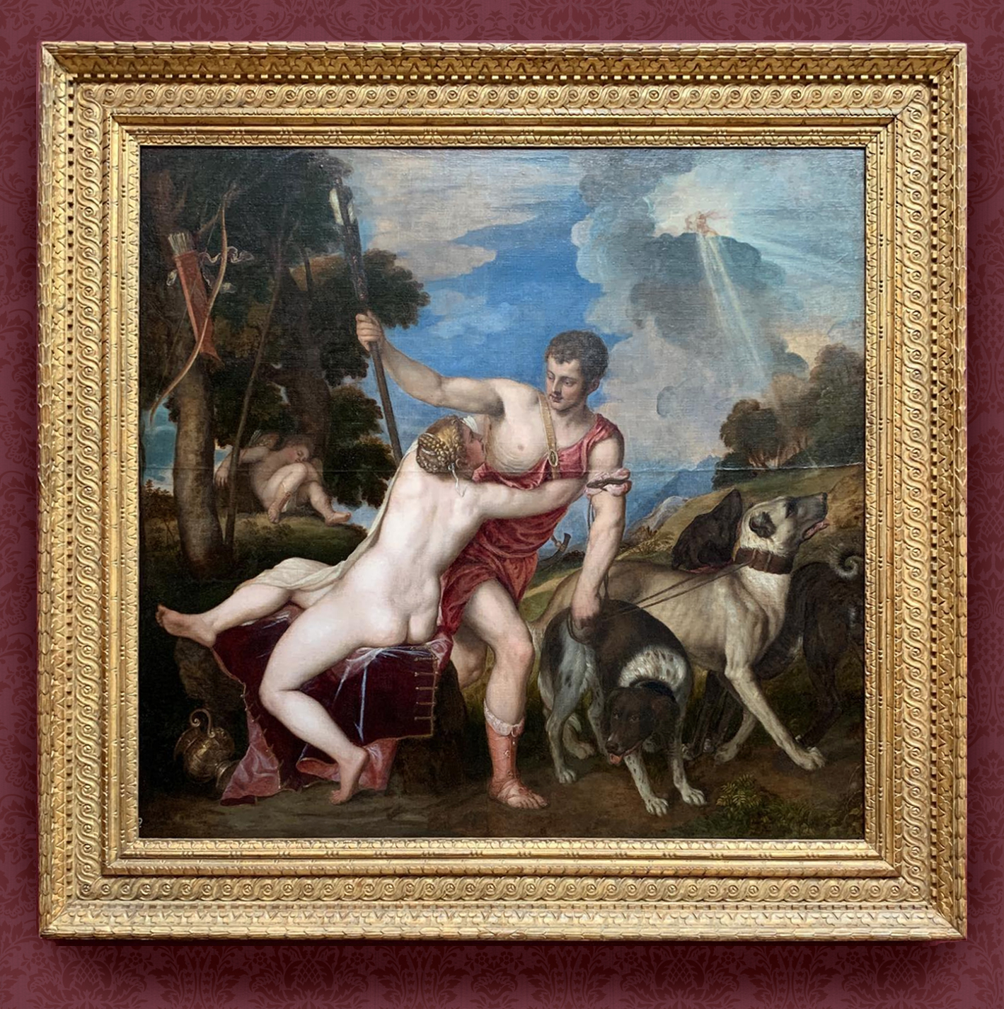 Titian (1490-1576), Venus and Adonis, 1554, o/c, 186 x 207 cm., revival cassetta frame, in new Pietà frame, Museo del Prado