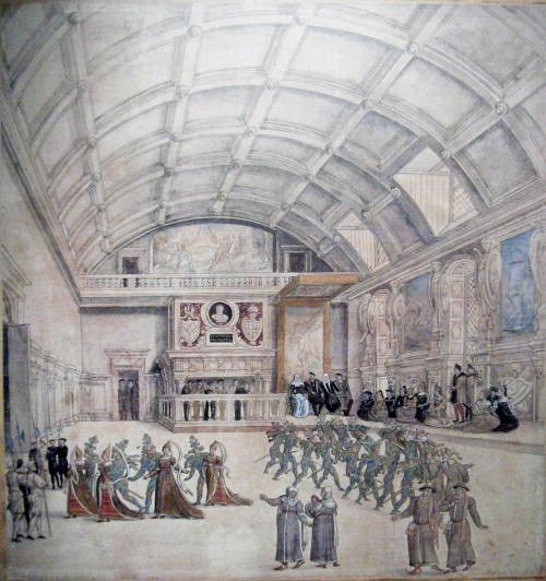 Anon. 16th century artist, Mary of Hungary receiving Charles V at her castle in Binche, watercolour; no size, no location