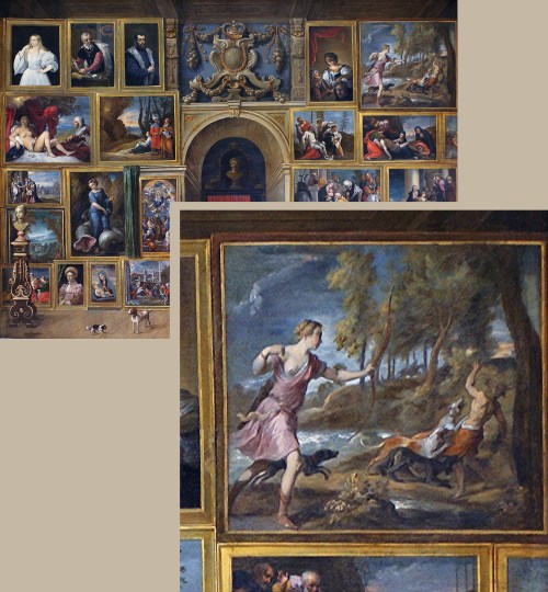 David Teniers (1610-90), Archduke Leopold Wilhelm in his picture gallery in Brussels, 1651, o/c, 96 x 129 cm., and detail of Titian, The death of Actaeon, Musées royaux des Beaux-Arts de Belgique