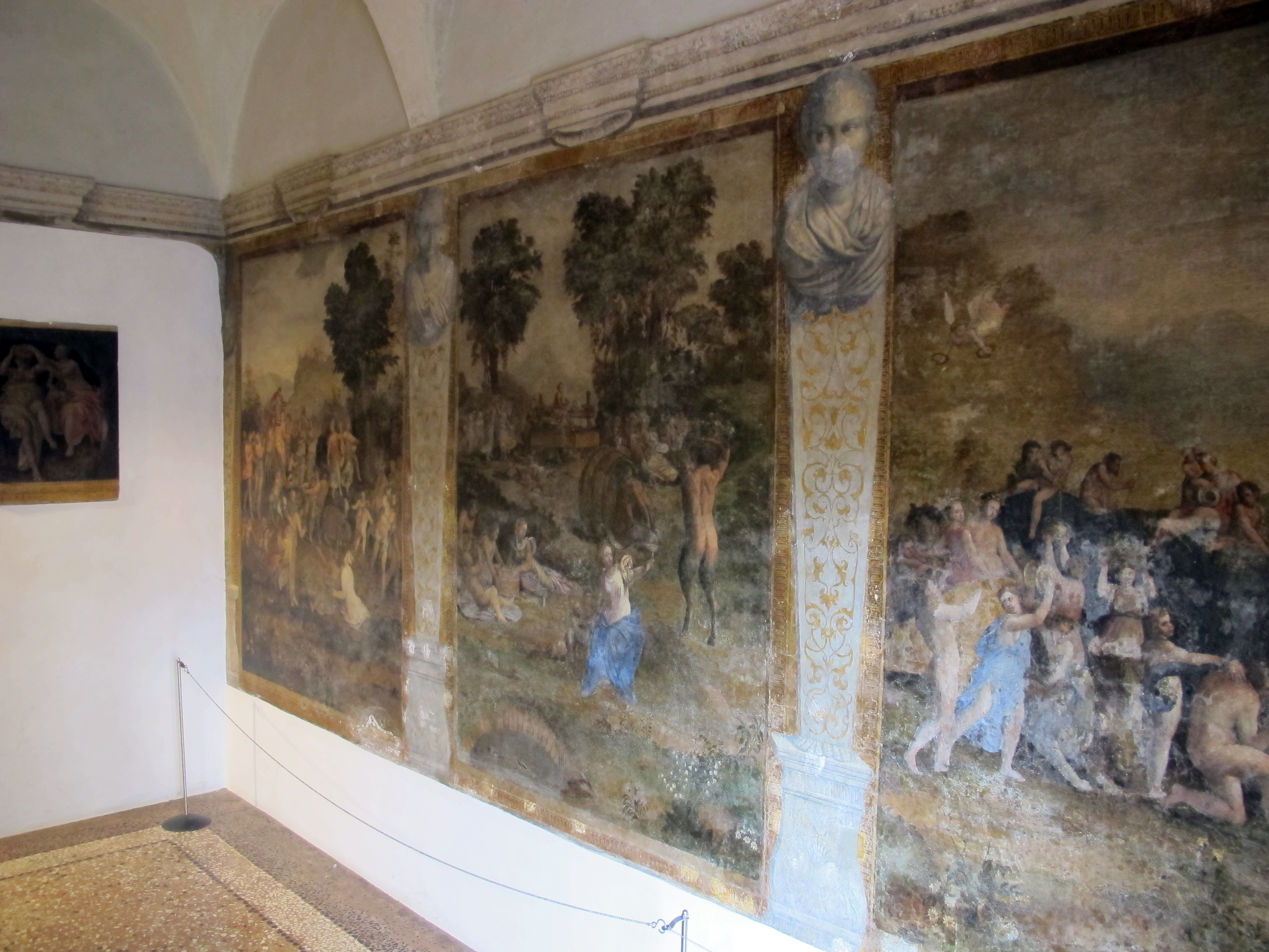 A surviving wall of later frescos in Alfonso II’s apartments shows the manner of integrating pictures into these rooms with trompe l’oeil architectural elements, which probably reflect the actual architectural settings in the earlier camerini.