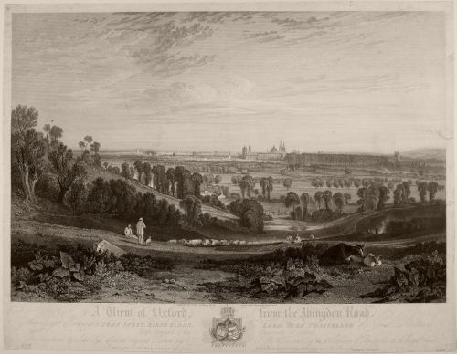 The success of High Street, Oxford caused Wyatt to commission a pendant from Turner, and, after flirting with the idea of a view from the opposite end of the High Street, they settled on a landscape with a distant prospect of the City – Oxford from the Abingdon Road (private collection) – which Turner ‘began …at Christmas’ (this was written in March 1812). Simultaneously with the progress of a second oil painting, the engraver was producing proofs of the engraving of the first, and the sending-in days for the Royal Academy exhibition were approaching, where both were to be submitted: