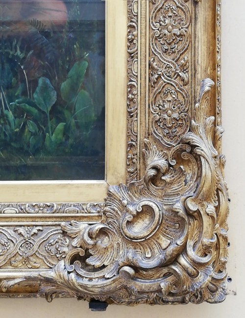 Cymon and Iphigenia must, almost certainly, have been framed by Wyatt himself, either for Millais to enter in the RA exhibition or after he had acquired it. It is a Victorian straight-edged frame, decorated in compo with several orders of running ornament, and flamboyant Rococo revival corners and centres which are pierced and relatively sculptural, considering their material. There are slight cracks in the compo, and elements have broken and been restored, but the main credit for the condition of this frame is probably Wyatt’s. The decoration, which includes a small foliate moulding on the back edge, a rather Gothic cusped and cruciform motif on the frieze, and an acanthus chain-&- bud at the sight edge, is very sharp and clearly defined. This is partly due to its not having been regilded several times, but also to the quality of the pressed compo and its treatment. Jacob Simon notes that Wyatt bought ready-made compo ornament from George Jackson in 1816-17, ‘and perhaps subsequently’ [24]; whether the frame for Cymon was made from scratch in his workshop, or whether he invested in the more expensive end of Jackson’s products, it is certainly of better quality and finer detail than many Victorian compo frames.