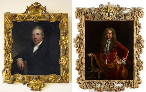 ‘The coat of arms in the distinctive pediment-topped frame which hangs directly above the portrait is probably the “ancient carved City Arms” which Wyatt had restored and donated to the city…’ [31]