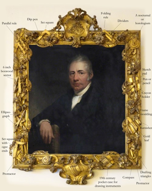 When Wyatt came to his own frame, he based that too on Ashmole’s portrait and its Gibbons extravaganza. He had no armorial bearings, so he replaced those at the crest with a Corinthinian capital, with the matching base on the bottom rail. The clusters of significant plants on the Gibbons frame were exchanged for the implements he saw as most important to his own accomplishments, and the draperies with a spiralling ribbon, whilst the link to Gibbons was made overt with the flowers which remained, twined amongst the man-made motifs