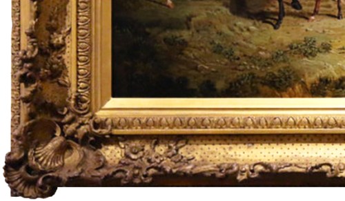 If it is compared with the painting by John Herrring, the differences are stark. Herring’s Victorian reproduction French Baroque frame is made of pine covered in compo and oil-gilded. Because compo is moulded and applied to the frame like slabs of plasticine or icing on a cake, it is quite flat, and doesn’t project, or emphasize the ornament with undercutting, so that the effect in the corners has little variation of depth. Inside the hollow, the framemaker has tried to reproduce the intricate textures carved by hand into the gesso of 18th century frames with an overall dimpling, pressed into the compo. The frame has been finished with oil gilding, which catches and holds dust and dirt. The result manages to be at the same time both fussy and flat, and has darkened a lot over time. In comparison Brown’s frame looks clean, simple and uncluttered; it does not overwhelm the painting, but provides a low relief decorative border able to mediate perfectly between the picture and the interior where it hangs. The water-gilding on the oak is still bright and pure, and softened by the underlying texture of the wood.