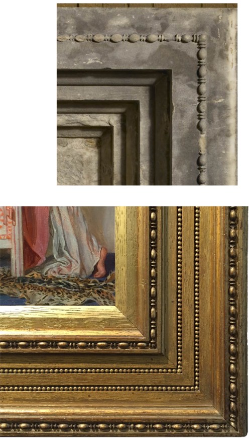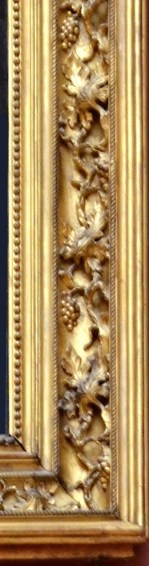 There were also individual painters who created one-off frames for particular works of art, such as Auguste Couder with his Victor Hugo polyptych and frame, and Ingres, who admired the Nazarenes, worked with them during his first period in Rome, and designed idiosyncratically-decorated frames throughout his career. The frame of Jeanne d’Arc…, above, has an intricately-moulded grapevine in the central hollow, symbolizing the Eucharistic element of the coronation.