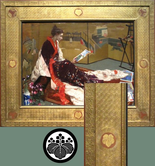 The four frames he had made for him that year are gilded oak, based on Brown’s and Rossetti’s patterns, including their flat profiles and their arrowhead moulding at the sight edge, as well as decorative roundels. But Whistler’s frames are also covered with incised Japanese and Chinese motifs, while the large medallions in the centres and corners reproduce Japanese ‘mon’ emblems faithfully and rather earnestly.