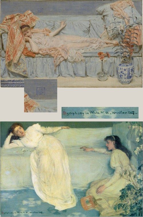 By 1865 Whistler was so intimate with Moore that he proposed forming a Société des Trois with him and Henri Fantin-Latour in Paris. The first work that he painted under Moore’s influence had a completely different style of composition, and far fewer oriental props than the four paintings of the year before. If we compare this picture (Whistler’s Symphony in white No III) with one painted by Moore in tandem with it (Lilies), we can see this alteration in Whistler’s style. He described the Symphony in white to Fantin Latour as his ‘purest’ painting yet, because he now paid ‘most attention to the composition’. Sadly, the original frame of neither painting is now in place – it would be very illuminating to compare them. However, we can compare the signatures, and see that Whistler has not yet adopted his butterfly emblem, whereas Moore’s logo of an anthemion is already part of the whole colour conception.