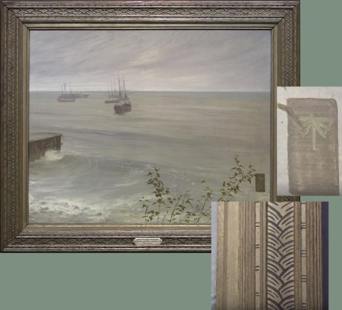 This metaphorical use of music in a visual medium is partly responsible for Whistler’s use of musical titles: his ‘Symphonies’, ‘Nocturnes’ and ‘Harmonies’, which also echo Moore’s use of non-specific titles for his figure groups, such as ‘Pomegranates’, ‘Apricots’, and ‘Azaleas’. Whistler’s Symphony in grey & green: The ocean was given his new butterfly signature on the canvas in the form of a glyph, like Moore’s, but Whistler’s was taken from Japanese prints, where Moore’s came from ancient Greek pottery. The signature was probably added in 1869 or 70, when the painting was also framed in an architrave design: this has a shallow profile carved with groups of reeded mouldings set at different intervals, a subtle japoniste fish-scale decoration, and two painted bands, again with different intervals between the marks (this surface decoration has been repainted, and another butterfly signature added). For all his protestations of originating frame designs, his debt to his peers, from Brown and Rossetti to Leighton and Moore, is clear.