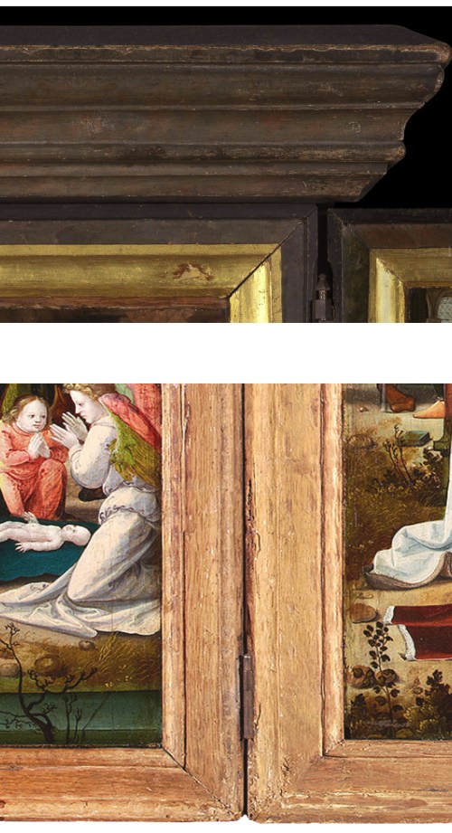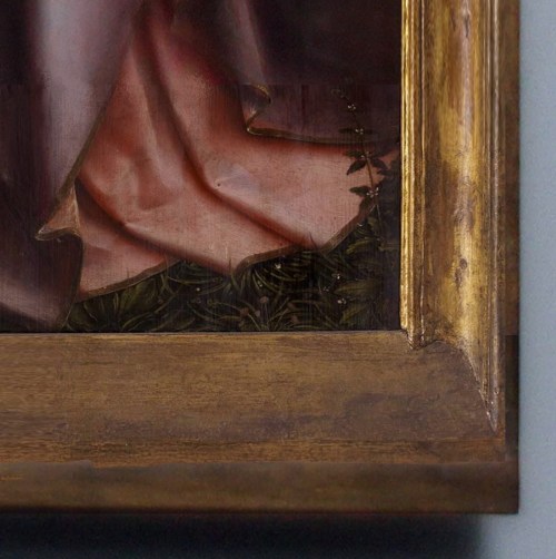 Other elements of Flemish frames interested them, too, as we can see by finding those works still in their original frames and on view at the time Brown and Rossetti were separately in Belgium. These include combinations of gilding with black or ebonized finishes; narrow rounded or reeded mouldings; gold on black motifs; and flat painted corner ornaments.