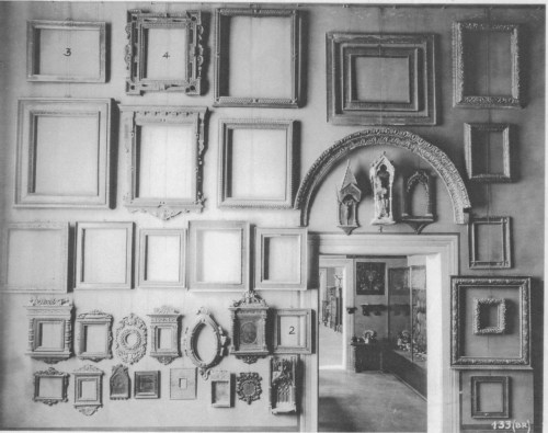 Not only did Bardini alter and construct frames for the works that he acquired, but he also appears to have been an early appreciator and collector of frames as works of art in their own right. As early as 1900, archive photographs of the interior of his palazzo reveal that he dedicated an entire wall to the hanging of empty frames, grouping these by size and creating both horizontal and vertical lines to lead the viewer’s eye. While Bardini must have had enough paintings or reliefs to fill this wall if he had so desired, instead he deliberately chose to focus attention on the workmanship and skill which had gone into the creation of these historic frames [3].